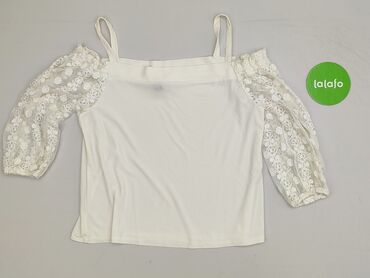 Bluzka damska off-shoulder w kolorze białym, rozmiar 38 (metka: WOMEN 38). - Krój hiszpański: odkryte ramiona z dwiema wąskimi ramiączkami. - Dekolt zdobiony szeroką koronkową aplikacją w motywy kw...