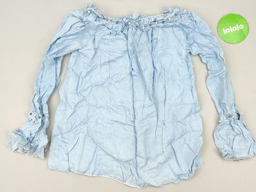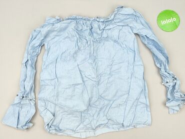 Bluzka damska hiszpanka, błękitna - Fason: hiszpanka z elastyczną, marszczoną gumką wokół dekoltu (można nosić opuszczoną na ramiona) - Rękawy: długie, lekko bufiaste, zakończone subtelną falbaną ...