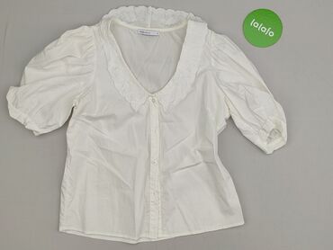 Bluzka damska BM, rozmiar M. - Kolor: kremowy/ecru - Krótki rękaw - Dekolt okrągły - Przód z ozdobnym panelem w roślinnym, beżowym wzorze - Listwa z guzikami dekoracyjnymi na środku - Delikatnie e...