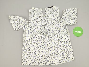 Biała bluzka damska House, rozmiar M. - Fason z odkrytymi ramionami (cold shoulder) - Falbana z przodu - Okrągły dekolt - Zapięcie na guziki z tyłu na całej długości - Krótkie rękawki z marszczenie...