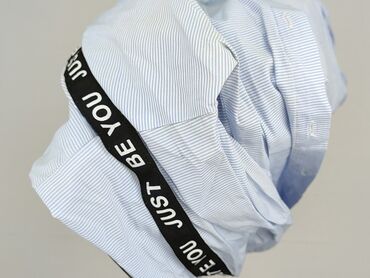 Długi rękawBluzka damska w kolorze jasnoniebieskim w paski, z długimi rękawami zakończonymi mankietami. Wzdłuż ramion i rękawów wszyte są czarne taśmy z napisem „JUST BE YOU”. Bluzka posiada klasyczny kołnierzyk i zapięcie na guziki. Jej krój sprawia, że jest odpowiednia do noszenia na co dzień, a także do bardziej swobodnych stylizacji.