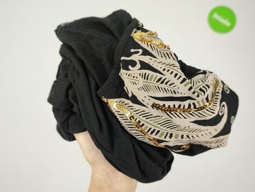 Krótki rękawCzarna damska bluzka oversize z krótkim rękawem i okrągłym dekoltem. Przód zdobi bogata aplikacja w kształcie piór w kolorze beżowo‑złotym, wykończona cekinami w odcieniu złota, które nadają blasku. Krój luźny, z asymetrycznym dołem (dłuższe boki). Materiał cienki, miękki, elastyczny, jednolity czarny. Idealna do stylizacji casual i wieczorowych – świetnie łączy się z jeansami, spódnicą lub szortami. Detale wykończenia i szwy widoczne na zdjęciach.