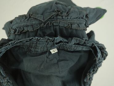 Krótki rękawCzarna damska bluzka z krótkim rękawem i kołnierzykiem stójką, zapinana na guziki z przodu. Dekolt z ozdobnymi falbankami, w talii wszyty pasek/sznureczek do lekkiego ściągnięcia i podkreślenia sylwetki. Rękawy z delikatnymi zakładkami i marszczeniami. Długość tunikowa – sięga poniżej bioder. Rozmiar z metki: L. Materiał lekki, przewiewny (skład niepodany na metce). Kolor: głęboka czerń. Uniwersalna, sprawdzi się do pracy i na co dzień, dobrze wygląda z jeansami lub spódnicą.