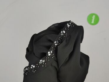 Elegancka czarna bluzka damska z dekoracyjnym dekoltem. Bluzka posiada satynowe wstawki na wysokości klatki piersiowej i pleców oraz zdobienia z dużych, mieniących się kamieni wokół dekoltu. Rękawy...Stan: