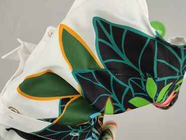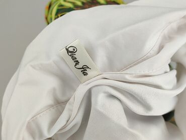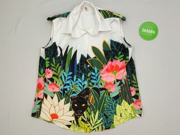 Bez rękawówBluzka bez rękawów DianJia z kołnierzykiem, zapinana na guziki. Model o luźnym kroju, z lekko wydłużonym tyłem. Góra w kolorze białym, dół pokryty barwnym, graficznym nadrukiem dżungli z motywem pantery, liści i kwiatów (odcienie zieleni, różu, żółci, błękitu, czerni). Materiał gładki, lekko satynowy w dotyku.