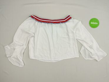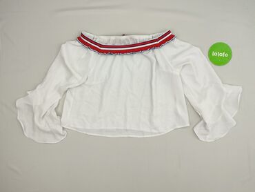 Biała, krótka bluzka koszulowa z falbankami - Krój: crop top do talii, dół wykończony elastyczną gumką - Zapięcie: z przodu na guziki - Dekolt: w kształcie litery V z kołnierzykiem - Rękawy: krótk...