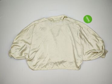 Bluzka damska z delikatnie połyskującej tkaniny w kolorze ecru/kremowym. - Krój luźny, lekko wydłużony tył - Dekolt w kształcie litery V z krótką stójką - Rękawy 3/4 zakończone elastyczną gumką - ...