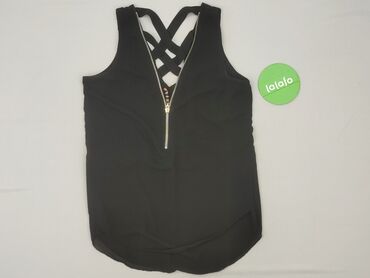 Czarna damska bluzka bez rękawów - Fason: luźny top z podkrojem pod szyją typu halter - Dekolt: wysoka stójka z wcięciem z przodu; zapięcie z tyłu na mały guzik - Krój: lekko wydłużony i zaokrąglo...