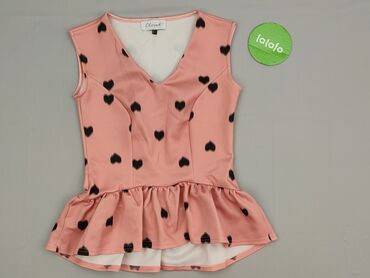 Bluzka damska SHEIN, rozmiar XS (EU 34, US 2). - Kolor: pudrowy róż - Wzór: czarne serduszka na całej powierzchni - Fason: luźny, bez rękawów - Rękawki: krótkie z falbaną przy ramionach - Dekolt: ...Stan: