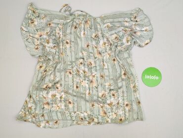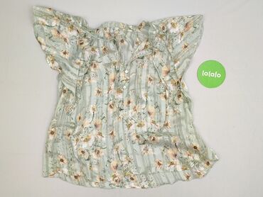 Damska bluzka w kwiaty - Krój: luźny, lekko wydłużony tył, dekolt w kształcie V - Rękaw: krótki, opadający (kimono/cap sleeves) - Wzór: drobne białe kwiaty na pastelowo-zielonym tle - Materiał: ci...