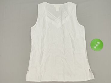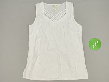 Biała damska bluzka bez rękawów - Krój: luźny, z opuszczonymi ramionami (cap sleeves), lekko wydłużony tył z zaokrąglonym dołem - Dekolt: w kształcie litery V z krótką stójką - Rozmiar: XL (na met...