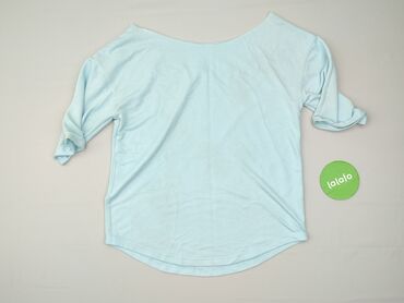 Bluzka damska w kolorze jasnego błękitu. - Krój: luźny, lekko dłuższy tył typu high-low - Rękaw: 3/4 - Dekolt: łódka - Materiał: cienka, miękka dzianina; dół wykończony półtransparentną wstawką/la...