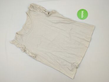 Beżowa bluzka damska z krótkim rękawem - Fason: luźny, prosty krój - Dekolt: w kształcie litery V z przodu; z tyłu wiązanie na cienkie, plecione troczki - Rękawy: krótkie, lekko falbaniaste - Mate...