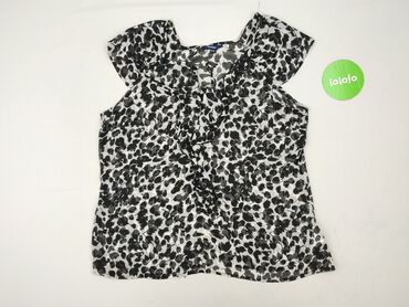 Bluzka damska z krótkim rękawem, rozmiar XL. - Krój: luźny, z dekoltem w serek zapinanym na guziki. - Wzór: białe tło w drobne czarne kropki z niebieskimi, graficznymi motywami/kwiatami. - Ma...