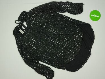 Czarna bluzka koszulowa z brokatowym połyskiem i srebrzystymi kropkami. Model z kołnierzykiem wiązanym pod szyją na tasiemki, zapinany z przodu na guziki. Długie rękawy zakończone elastyczną gumką. Tył wydłużony, półokrągłe wykończenie dołu. Materiał elastyczny i miękki: 87% poliester, 8% lurex, 5% spandex. Metka: New Collection. Wyprodukowano we Włoszech. Idealna na wieczór, imprezę lub stylizacje świąteczne – delikatnie mieni się przy ruchu i świetle.