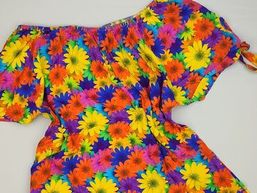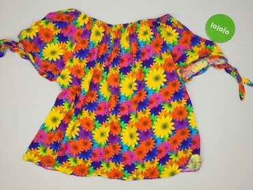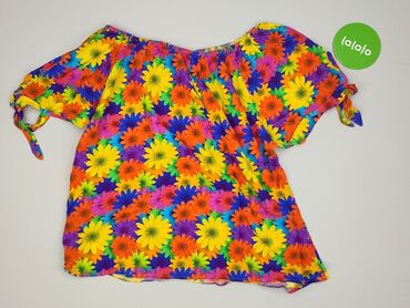 Bluzka damska w kwiaty - Krój: luźny, z zaokrąglonym dołem; bez zapięcia, wkładana przez głowę - Rękawy: krótkie, szerokie, z delikatną falbaną/przeszyciami dającymi efekt bufki - Dekolt: okrągły ...
