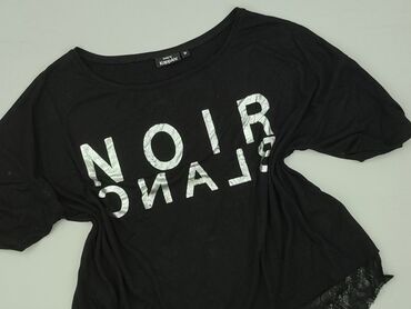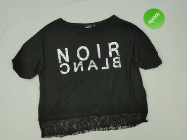 Krótki rękawCzarna bluzka damska KappAhl, rozmiar M. Luźny krój z obniżoną linią ramion i okrągłym dekoltem. Z przodu duży, srebrny nadruk NOIR BLANC w lustrzanym układzie liter. Dół wykończony koronkową, półprzezroczystą wstawką na całym obwodzie, dodającą lekkości i kobiecego charakteru.