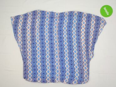 Niebieska bluzka damska marki EXHIBIT w rozmiarze 8, ozdobiona kwiatowym wzorem. Charakteryzuje się okrągłym dekoltem i zapięciem na guziki z tyłu. Wykonana w 100% z poliestru, co zapewnia jej lekk...Stan: