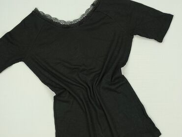 Czarna damska bluzka z ażurową koronką - Fason: dopasowany, krótki rękaw - Dekolt: okrągły z wstawką koronkową - Rękawy: bogato zdobione, ażurowa koronka z motywem kwiatowym - Przód: aplikacja z c...