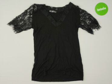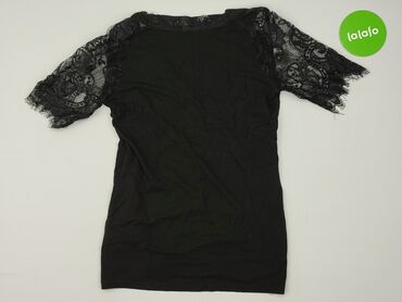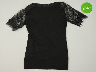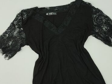 Czarna damska bluzka z ażurową koronką - Fason: dopasowany, krótki rękaw - Dekolt: okrągły z wstawką koronkową - Rękawy: bogato zdobione, ażurowa koronka z motywem kwiatowym - Przód: aplikacja z c...