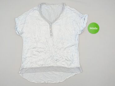 Bluzka damska w paski, z asymetrycznym wykończeniem - Krój: luźna, z krótkimi rękawami; jeden rękaw klasyczny, drugi z doszytym panelem i cienkim troczkiem. - Wzór i kolor: biało‑błękitne, ukośne ...