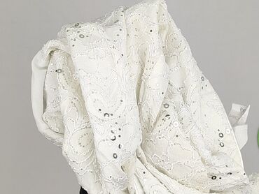 - Detale: bogaty, ażurowy wzór koronki z naszytymi cekinami, lamówka przy zapięciu i na mankietach, kołnierzyk w kształcie V.