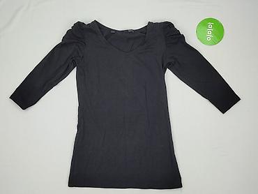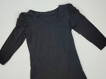 Czarna damska bluzka z dekoltem w serek i rękawem 3/4. Lekko dopasowany krój, długość do bioder. Na ramionach marszczenia tworzące delikatne bufki, które nadają bluzce subtelnie elegancki charakter. Gładka, jednolita tkanina dzianinowa przyjemna w dotyku, elastyczna – dobrze układa się na sylwetce. Idealna do stylizacji casualowych i smart-casual: do jeansów, spódnic czy pod marynarkę. Kolor: czarny. Dla kobiet. Stan: bardzo dobry, używana.