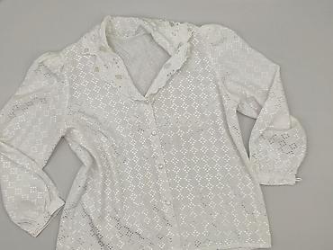 Damska bluzka z długim rękawem w kolorze białym. Delikatna, półprzezroczysta tkanina z ażurowym, geometrycznym wzorem i subtelnym połyskiem. Fason zapinany na guziki z przodu. Rękawy lekko bufiaste, zakończone mankietami na guziki. Ozdobny kołnierz z koronkową aplikacją i wycięciem w kształcie litery V. Lekko podkreślona linia ramion.