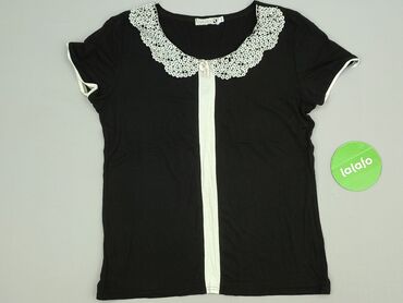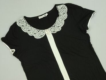 Czarna bluzka damska z dekoltem V - Krój: luźny, z krótkim rękawem - Dekolt: w kształcie litery V ozdobiony koronkową lamówką z motywem kwiatowym - Materiał: miękka, cienka dzianina (skład nie pod...