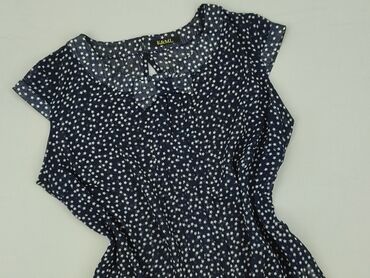 Granatowa bluzka damska w drobny, kwiatowy wzór - Krój: swobodny, z krótkim rękawem - Dekolt: kopertowy w kształcie litery V z marszczeniem przy ramionach - Długość: do bioder - Wzór: drobne kwiat...