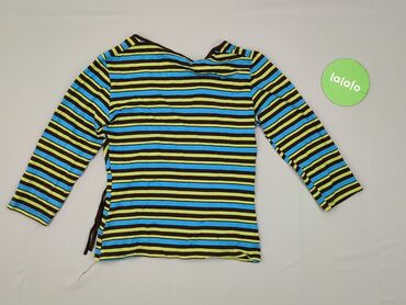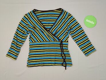 Bluzka damska z długim rękawem, rozmiar S. - Krój: dopasowany, długość do bioder - Dekolt: okrągły, z ozdobną wstawką i kontrastowym, czarnym panelem po prawej stronie - Wzór: kolorowe, poziome pa...Stan:
