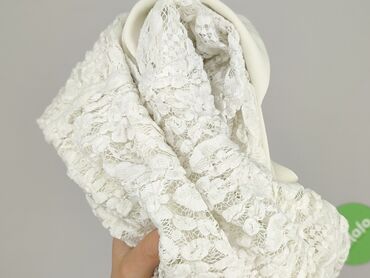 Biała bluzka damska z krótkim rękawem - Luźny, lekko kimonowy krój - Dekolt w kształcie łódki - Ażurowe, koronkowe wstawki na ramionach i rękawkach z motywem kwiatowym - Dół zakończony delikatną gu...