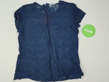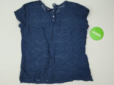 Bluzka damska w kolorze granatowym, rozmiar XL. - Krój: luźny, z okrągłym dekoltem; subtelne zakładki z przodu. - Rękawy: krótkie, wykonane z ażurowej koronki o kwiatowym wzorze. - Materiał: lekki...