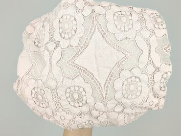 Biała damska koszula z krótkim rękawem, zapinana na guziki. - Fason prosty, lekko luźny, z niewielkimi rozporkami po bokach u dołu. - Ozdobny kołnierzyk z ażurowym, koronkowym wycięciem w kształc...