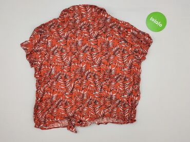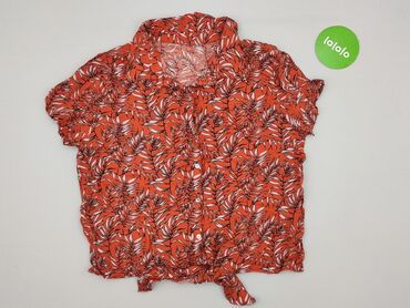 Bluzka damska z krótkim rękawem, wzór kwiatowy. - Kolor: intensywny pomarańcz z wielobarwnym, roślinnym printem (odcienie zieleni, fioletu, różu i kremu) - Krój: luźny, nietoperzowe rękawy; dekolt...Stan: