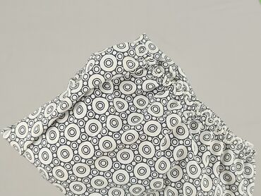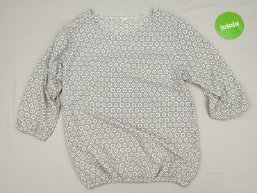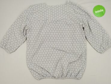 Bluzka damska z długim rękawem, rozmiar L. - Wzór: geometryczny, retro – beżowo-szare prostokąty i owalne motywy na białym tle - Fason: luźny, prosty krój - Dekolt: w serek z krótką listwą guzikow...