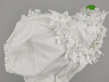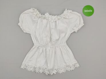 Bluzka damska off-shoulder w kolorze białym, rozmiar 38 (metka: WOMEN 38). - Krój hiszpański: odkryte ramiona z dwiema wąskimi ramiączkami. - Dekolt zdobiony szeroką koronkową aplikacją w motywy kw...