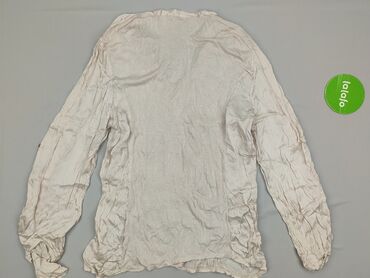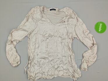 Długi rękawLindsay Moda to damska bluzka z długim rękawem i dekoltem w kształcie litery V, wyprodukowana we Włoszech. Charakteryzuje się delikatnie pogniecioną teksturą materiału i jasnym beżowym kolorem, co nadaje jej swobodny, a jednocześnie elegancki wygląd. Bluzka posiada długie rękawy zakończone mankietami oraz wiązania po bokach, co pozwala na regulację dopasowania. Jest to wszechstronny element garderoby, odpowiedni do noszenia na co dzień, jak i na bardziej formalne okazje.