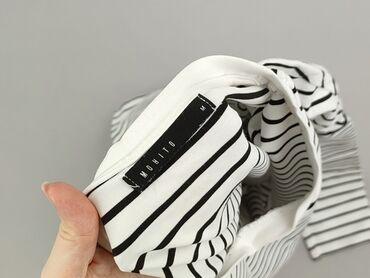 Bluzka damska MOHITO - Model: bluzka w pionowe paseczki - Kolor: biały w granatowe/czarne cienkie paski - Rozmiar z metki: 32 - Krój: luźniejszy, dół lekko ściągnięty gumką - Dekolt: okrągły z fal...