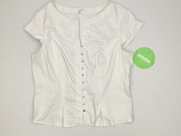 Biała bluzka koszulowa z krótkim rękawem - Krój: prosta, lekko luźna sylwetka; rozcięcia po bokach u dołu dla większej swobody. - Zapięcie: na guziki z przodu (plisa zakrywająca zapięcie). - Kołni...