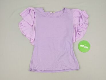 Bluzka damska Me & You w kolorze lawendowym. - Fason: prosty, z bogatymi falbanami z przodu i z tyłu - Rękawy: krótkie bufiaste, zakończone marszczeniem - Dekolt: okrągły; z tyłu łezka zapinana na...