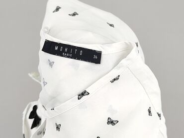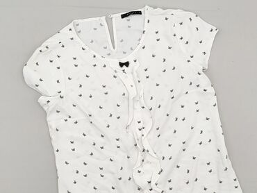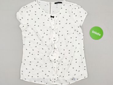 Bluzka damska Mohito Basic - Model: krótki rękaw - Wzór: białe tło w czarne (i nieliczne szare) grochy - Dekolt: z przodu okrągły, z tyłu wycięcie w kształcie V wiązane kokardką - Rozmiar z metki:...