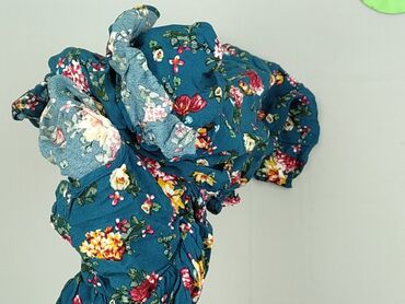 Bluzka damska SURE, rozmiar 38 - Krój: kopertowy przód z wiązaniem pod biustem, lekko rozkloszowany dół z falbaną; krótkie rękawy. - Wzór i kolor: kwiatowy print w odcieniach niebieskiego, fioletu...