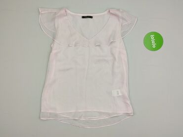 Bladoróżowa bluzka damska Alter Hours by Mohito, rozmiar XS. - Fason: krótki rękaw, okrągły dekolt - Konstrukcja warstwowa: na wierzchu lekka, półprzezroczysta siateczka; pod spodem miękka dzianin...