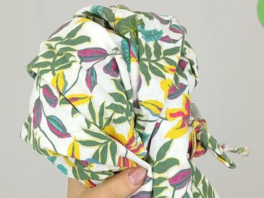 - Wzór: tropikalny, kwiatowo‑liściasty; tło białe, kwiaty w odcieniach żółtego, różu i turkusu, zielone liście