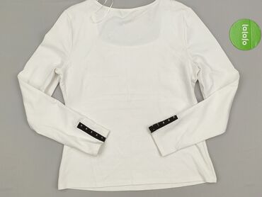 Bluzka Orsay, biała, prążkowana. - Krój: dopasowany, dekolt w serek z przodu, ozdobne wycięcie w kształcie rombu na plecach. - Rękawy: krótkie, lekko bufiaste; na każdym rękawie rząd ozdobnych guz...