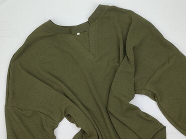 Bluzka damska oversize w kolorze khaki/oliwkowym. - Fason: luźny, nietoperz, przedłużany tył - Dekolt: w kształcie litery V - Rękawy: 3/4 z możliwością podpięcia (guzik na jednym rękawie) - Materi...Stan: