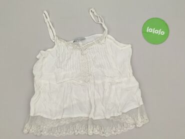 Biała damska bluzka bez rękawów z ozdobnym dekoltem V. - Rozmiar: M (metka) - Materiał: 100% poliester (metka) - Krój: luźny, top bez rękawów - Dekolt: głęboki w kształcie litery V - Wykończenie: ...