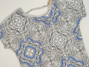 Bluzka damska RESERVED, rozmiar S. - Krój: luźny, z krótkim rękawkiem typu nietoperz - Przód: półtransparentna warstwa z nadrukiem w liście/geometryczne paski w odcieniach brązu i bieli - Tył: gła...