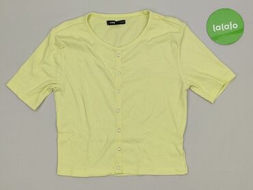 Bluzka Sinsay, rozmiar M. - Kolor: jasnożółty (pastelowy) - Krój: dopasowany, długość do pasa - Rękawy: krótkie - Dekolt: okrągły - Zapięcie: rząd metalowych nap na środku przodu - Materiał prążko...
